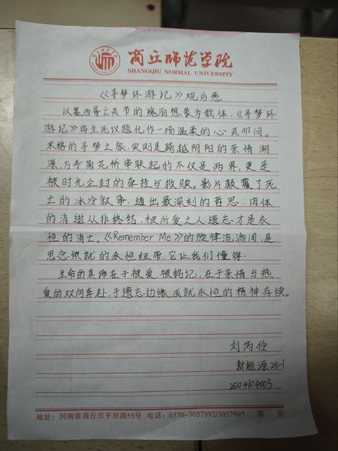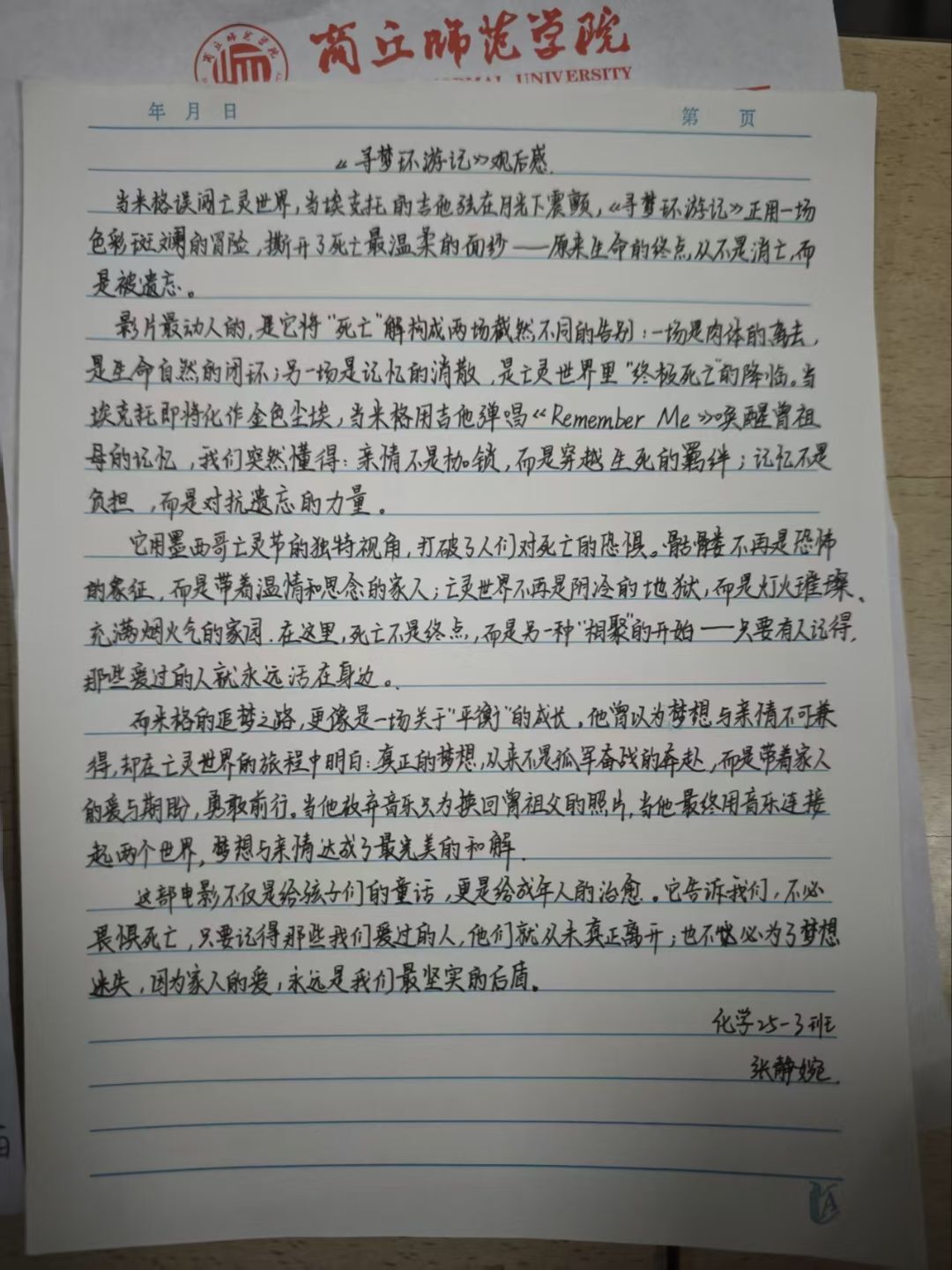 本次活动放映的影片是《寻梦环游记》。片中男孩米格怀揣音乐梦想,却因家族禁忌与现实相悖,意外闯入五彩斑斓的亡灵世界。这场跨越生死的亲情之旅,打破“死亡是终点”的固有认知,用温情叙事诉说:铭记的思念、血脉的羁绊、心底的热爱,这些跨越阴阳的牵挂,正是生命永恒的印记。影片结束后,同学们陆续拿起笔写下心得,不少文字里提到“要珍视日常的亲情陪伴”,也有人写道“要留住心底的热爱,让它成为生活的动力”。